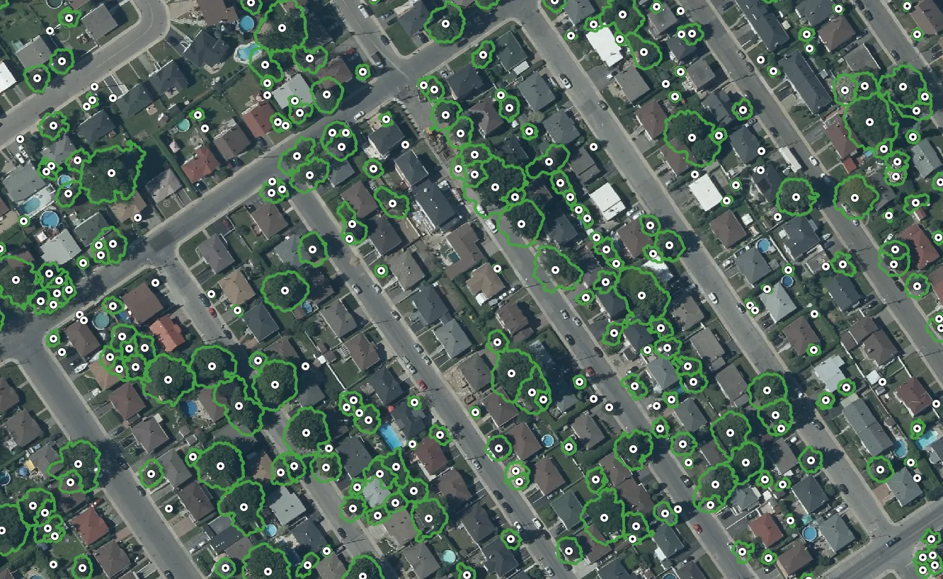 Imagery workflows can use orthorectified imagery, aerial imagery, and project boundaries to produce mapped features at parcel, corridor, municipal, or portfolio scale.
